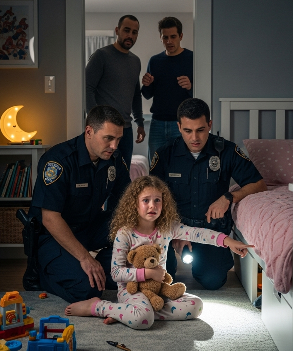 Mia siedziała na dywaniku w swojej sypialni w piżamie z maleńkimi księżycami, ściskając pluszowego misia jak tratwę ratunkową. Nie pobiegła do funkcjonariuszy. Po prostu wskazała – na małe łóżko z idealnie złożoną różową kołdrą w rogu. „Głos dochodzi stamtąd” – wyszeptała. „Spod spodu”. Funkcjonariusz Patel uklęknął, uniósł falbanę łóżka i poświecił latarką. Kłębki kurzu. Upadła kredka. Kulka. Nic niezwykłego. Stał, gotowy do łagodnej przemowy o cieniach i opowieściach. „Wygląda wyraźnie, dzieciaku” – zaczął.