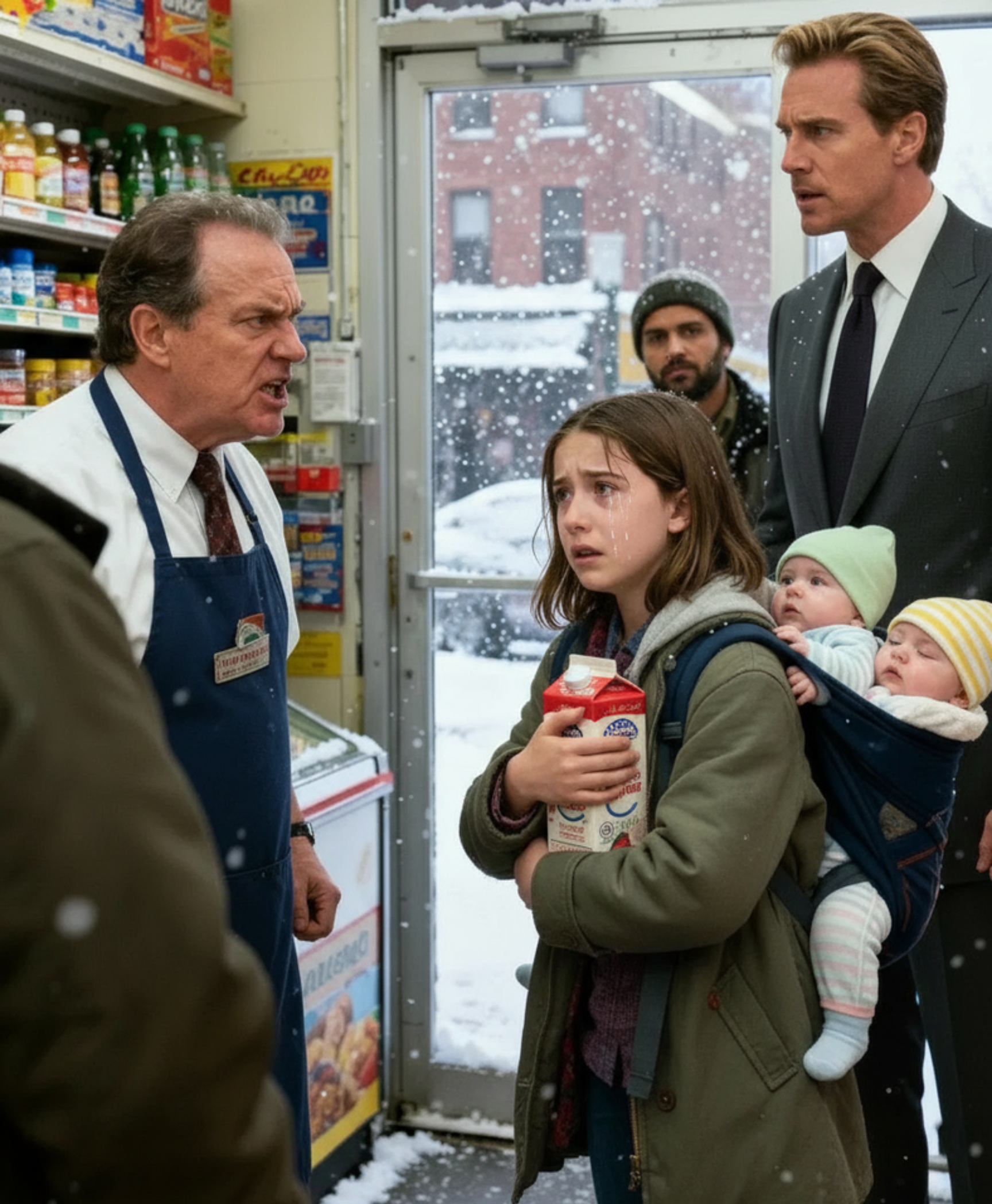Ale desperacja nie przyniosła współczucia. Kierownik sklepu, mężczyzna po pięćdziesiątce, pan Reynolds, natychmiast ją złapał. Zamiast zadawać pytania, pociągnął ją za ramię, strofując przy wszystkich, po czym wypchnął na zewnątrz. Emily stała na chodniku, drżąc z zimna, zbyt zawstydzona, by płakać jeszcze głośniej.