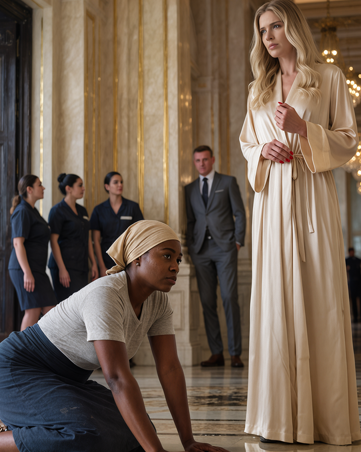 Już pierwszego ranka Naomi zawiązała chustę na włosach i zaczęła zmywać szeroką, marmurową podłogę. W domu panowała cisza – aż do momentu, gdy na schodach rozległ się głośny stukot obcasów.