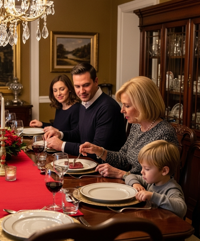 Moja mama – Margaret, znawczyni jedwabnych serwetek i delikatnej kontroli – nie podniosła wzroku. Nakładała łyżką antrykot (kawałek za 80 dolarów zarezerwowany dla jej ulubionego wnuka) na już zapełniony talerz mojego siostrzeńca. „Za mało” – powiedziała, idealnie opanowana. „Wcześniej zdenerwował Masona. Nie nagradzamy niewłaściwego zachowania”.