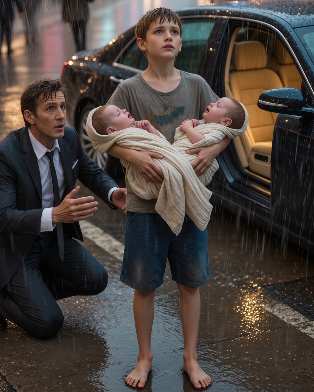 Adrian poczuł niezwykłe szarpnięcie. Opuszczając szybę, ryk burzy wypełnił samochód. Wtedy zdał sobie sprawę: zawiniątko w ramionach chłopca to nie było po prostu „coś”. To było dwoje maleńkich niemowląt, owiniętych w cienkie kocyki, których ciche łkania niemal zagłuszał deszcz.