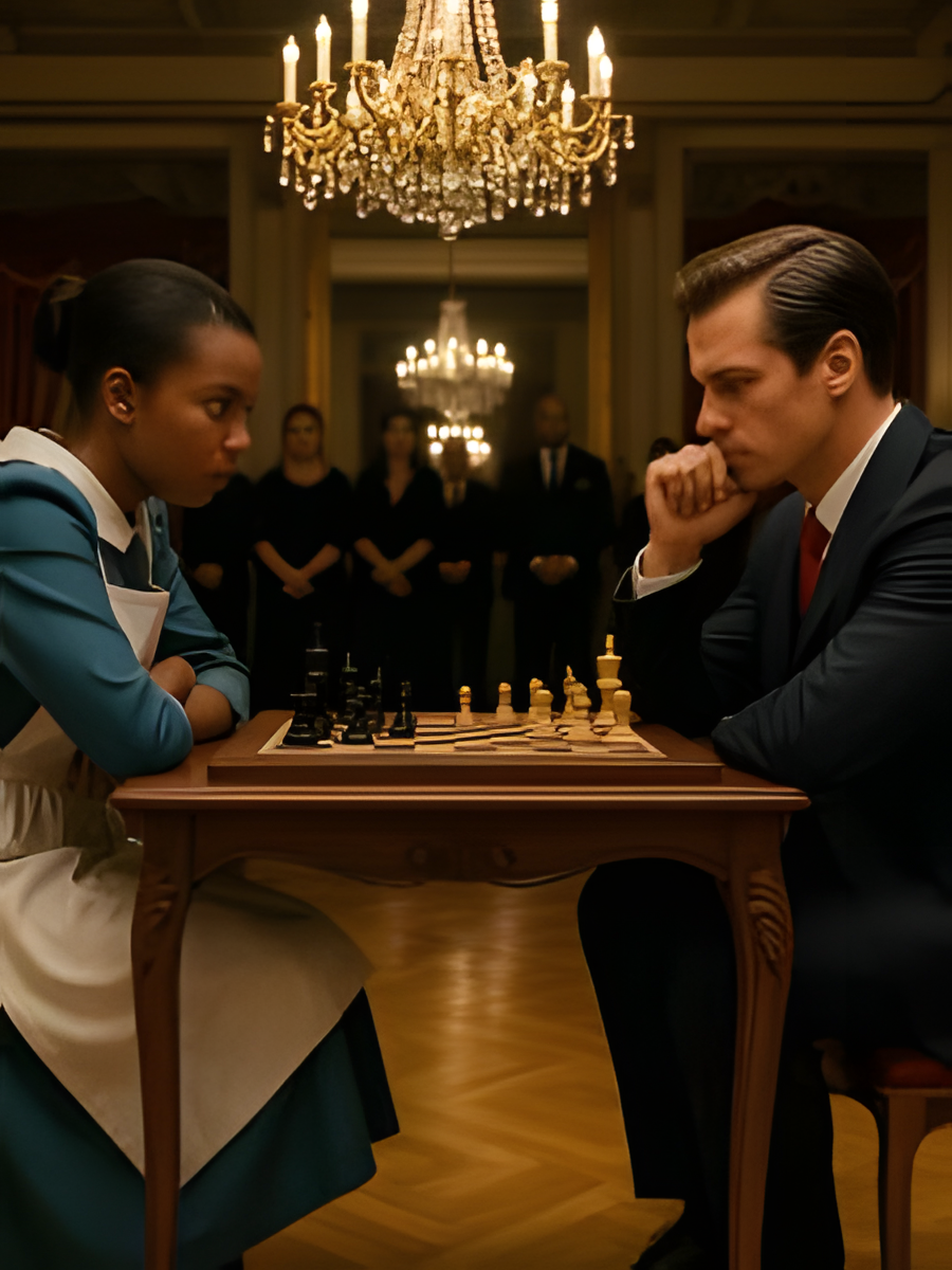 Podniósł głos przed wszystkimi gośćmi. „Ty, sprzątaczka, chodź tutaj. Chcę zobaczyć, czy naprawdę umiesz grać w szachy”.