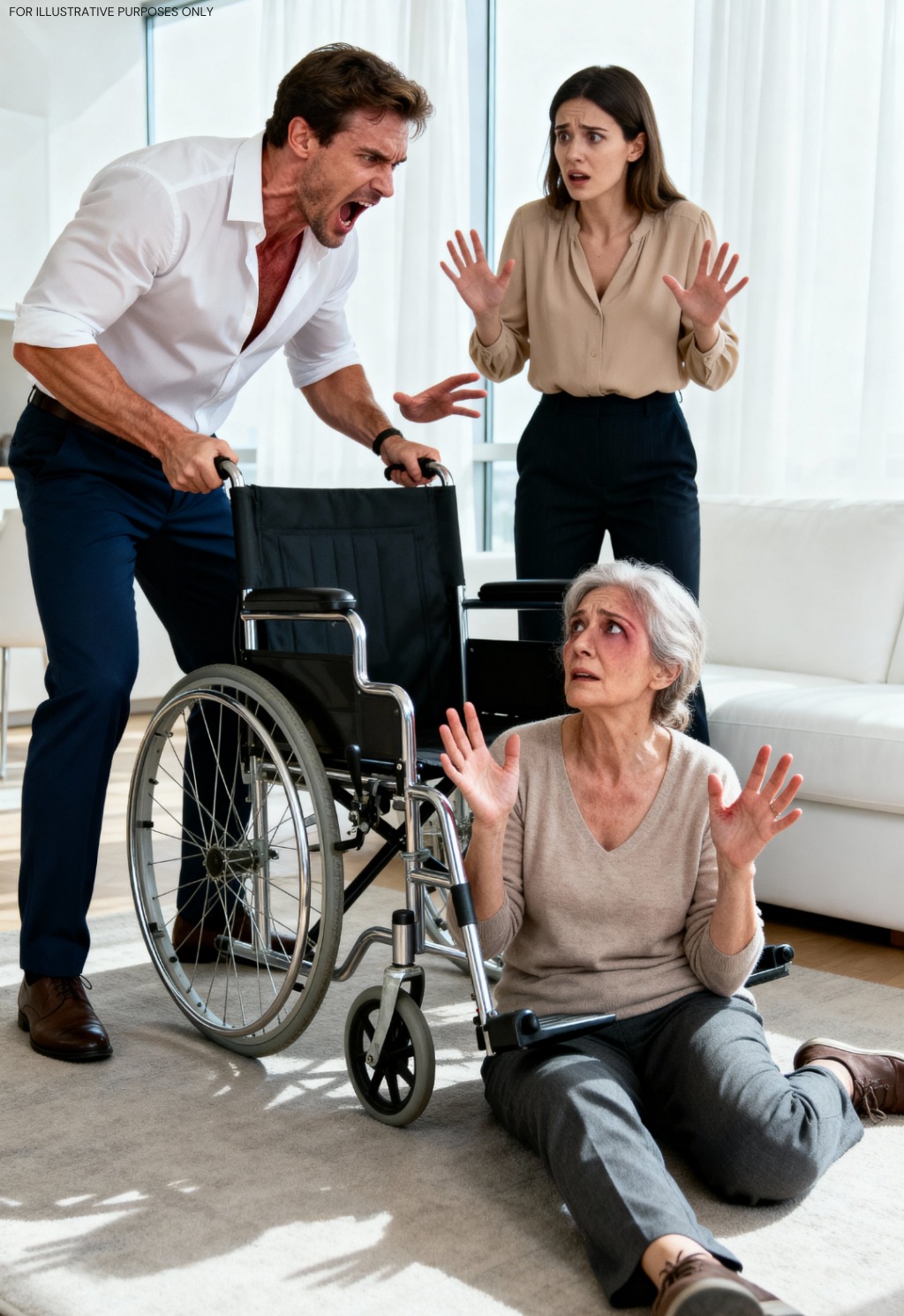 Leonard podbiegł do matki i delikatnie uniósł ją z powrotem na krzesło. Jego ręce drżały, gdy sprawdzał, czy na jej ramieniu nie ma siniaków. „Jesteś już bezpieczna, mamo” – wyszeptał, choć jego oddech był urywany.