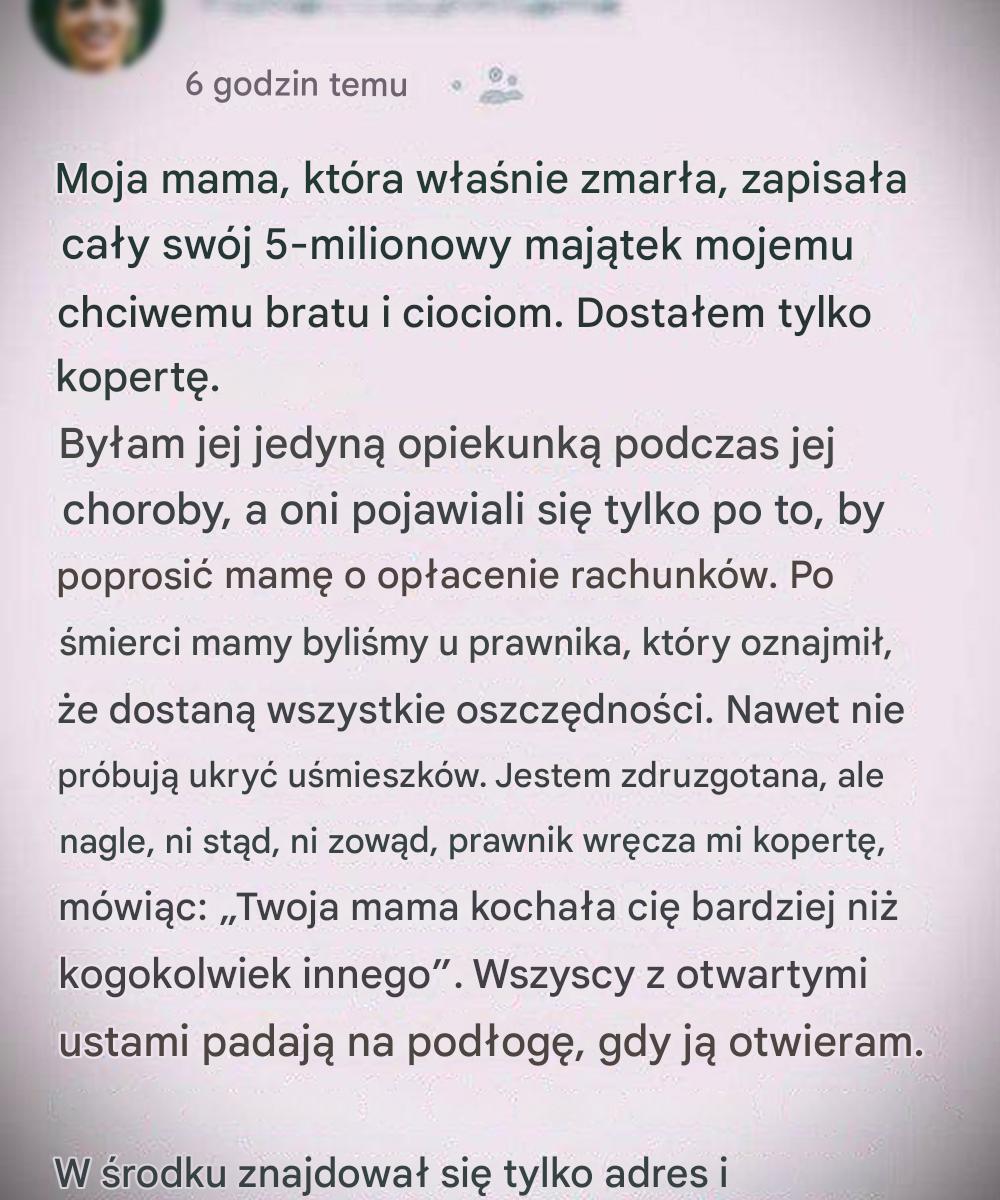 Moja mama, która właśnie zmarła, zapisała cały swój 5-milionowy majątek mojemu chciwemu bratu i ciociom. Dostałem tylko kopertę. Opiekowałem się nią podczas każdej nieprzespanej nocy i wizyty u lekarza, a oni przychodzili tylko wtedy, gdy potrzebowali pieniędzy.