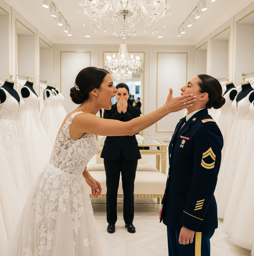 Siostra uderzyła mnie tak mocno, że konsultantka butiku aż jęknęła – a to było zanim nazwała mnie „ciężarem w mundurze wojskowym”. Nie wiedziała, że karta kredytowa, która zapłaciła za jej suknię ślubną za dziesięć tysięcy dolarów – i cały ślub za czterysta pięćdziesiąt tysięcy dolarów – była wystawiona na moje nazwisko, opłacona z mojego żołdu bojowego. A ja byłam pięć sekund od zamknięcia tego wszystkiego.