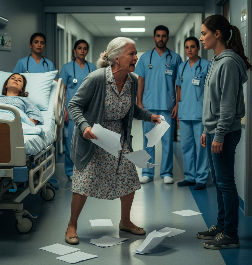 Stałem za stanowiskiem pielęgniarek w szpitalu St. Matthews w Portland, gdy moja matka rzuciła się przez ladę. „Pozwalasz jej umrzeć!” – krzyknęła, a jej głos rozrywał się na strzępy. Ręce jej drżały, gdy chwyciła teczkę z podpisem „ Emily Carter” – moje imię – i rozdarła ją na pół, zanim ktokolwiek zdążył ją powstrzymać. Papier zatrzepotał jak ranne ptaki po linoleum.