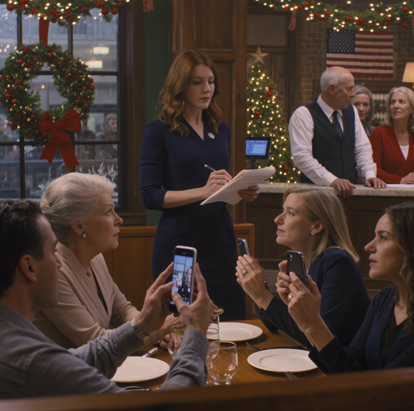 „Od nas wszystkich” – ogłosiła w restauracji, jakby prezentowała tacę z deserami.