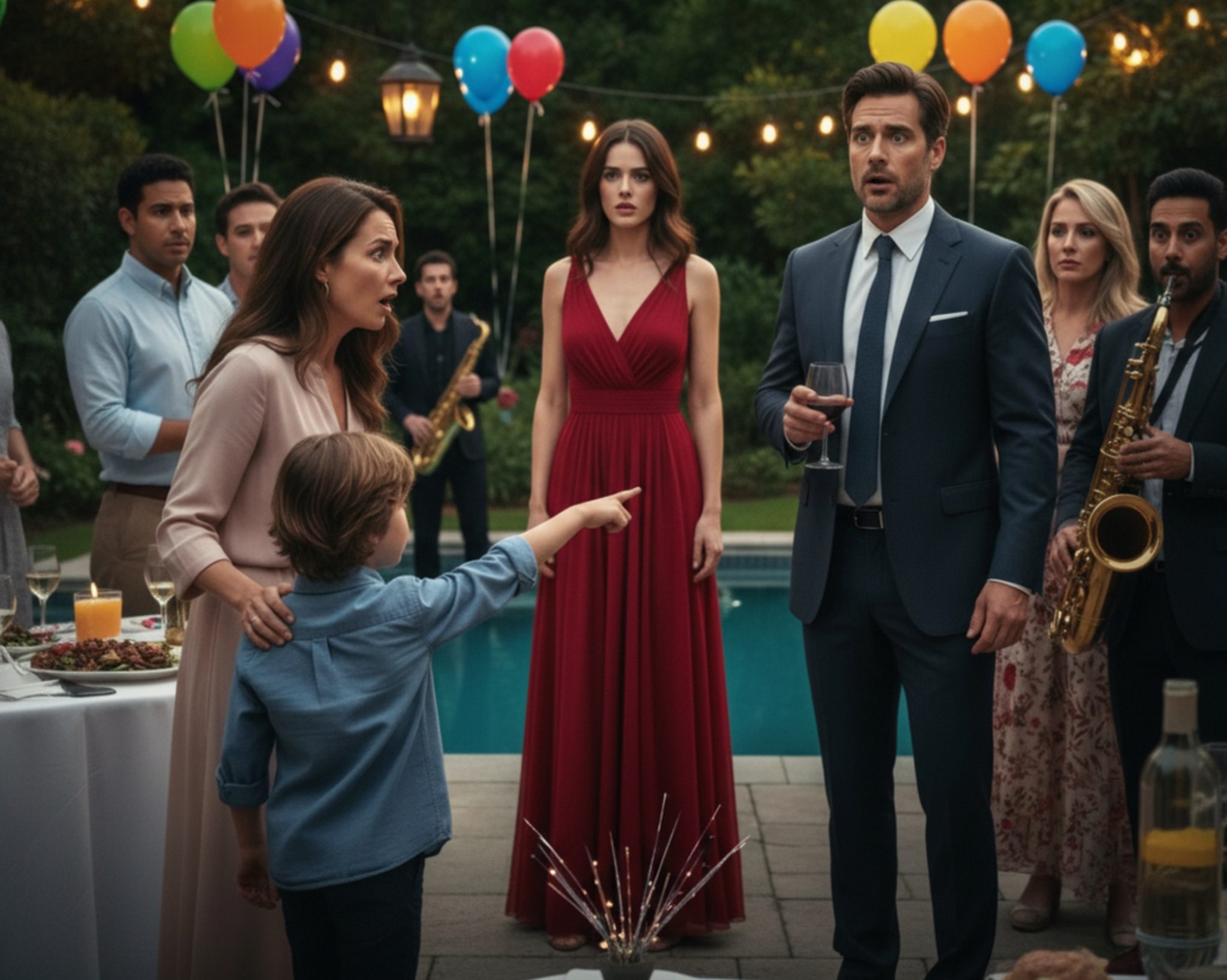 Podczas urodzin mojego męża, mój pięcioletni syn Ethan nagle wskazał na kobietę i powiedział: „Mamo, widziałem, jak tata ją całował na zewnątrz”. I wtedy noc się rozpadła.