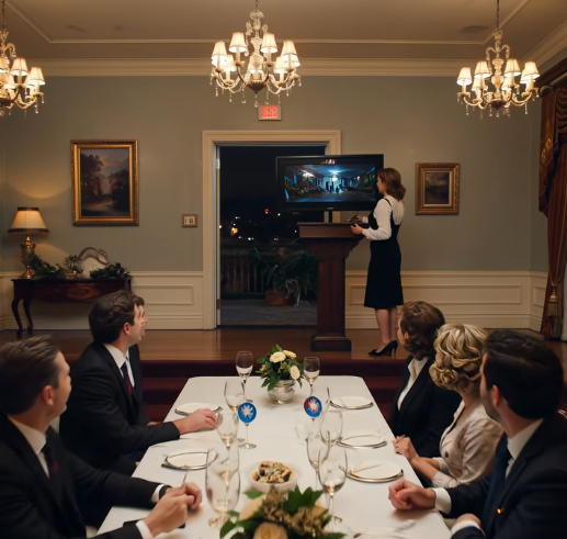 Odłożyłem widelec. Cichy dźwięk metalu uderzającego o porcelanę przebił się przez hałas. „Mówisz o czymś słuchowym” – powiedziałem. Mój głos był cichy, ale wyraźny. „Twoja firma próbuje to kupić”.