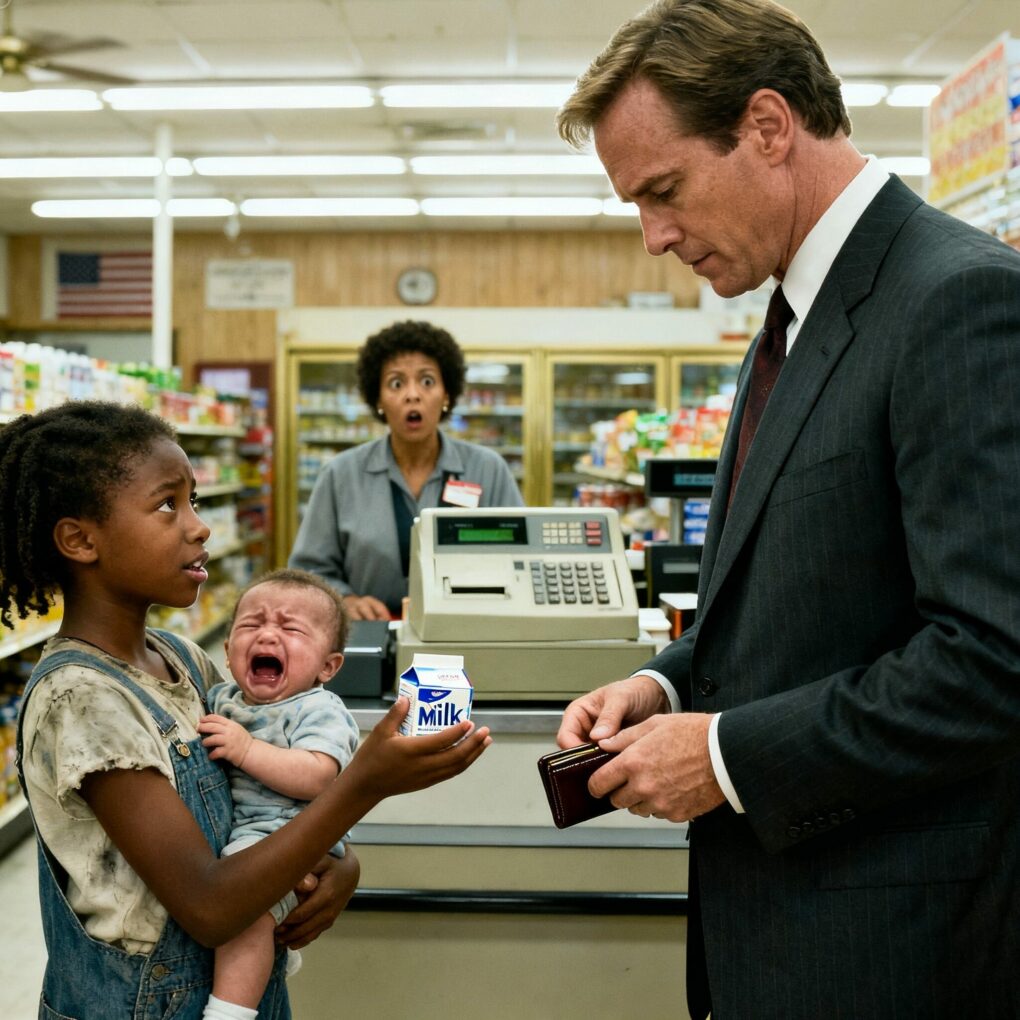 Keisha podeszła powoli, ściskając brata mocniej. „Proszę pana” – powiedziała głosem ledwie słyszalnym szeptem – „mój braciszek płacze. Nie mamy mleka. Czy mogłabym dostać jedno pudełko? Odwdzięczę się, jak dorosnę”.
