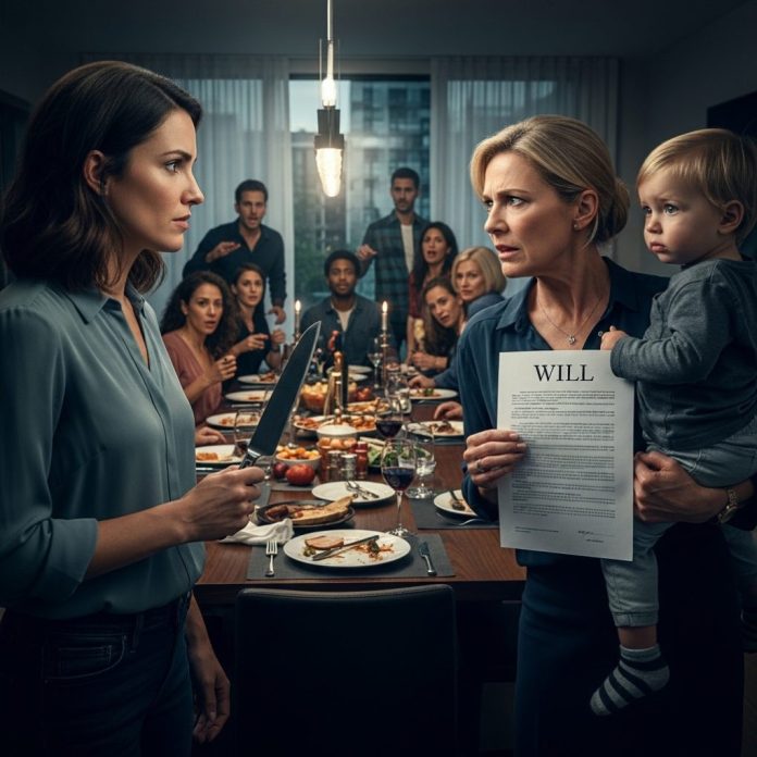 Zapadła cisza. Talerze przestały brzęczeć, śmiech ucichł, a nawet dziecko znieruchomiało, jakby zdało sobie sprawę z wagi jej słów. Mój mąż został pochowany niecałe dwa tygodnie wcześniej, a teraz zdrada nadeszła w pełnym ubraniu, odważna i publiczna. Nie poprzestała na tym. Unosząc teczkę w wolnej ręce, oznajmiła: „A jako jego spadkobierczyni, wezmę połowę twojego domu za osiemset tysięcy dolarów. Jego testament mówi o tym wyraźnie”.