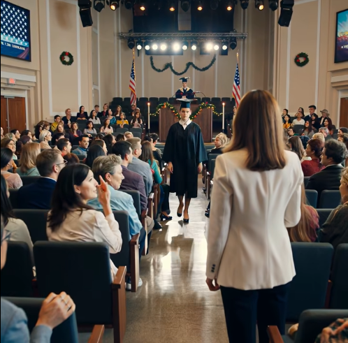 Byłem w połowie drogi do podium, gdy krzesło zaskrzypiało za mną, na tyle ostro, że rozdarło moment. Podczas mojej własnej ceremonii ukończenia szkoły, moja siostra wstała i wskazała na mnie palcem, jakby ogłaszała werdykt.