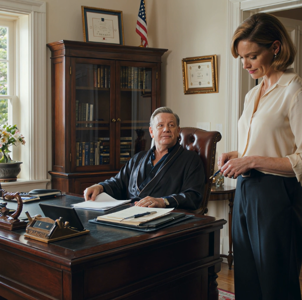 Siedział na moim krześle – moim skórzanym fotelu gabinetowym, wykonanym na zamówienie, który kupiłem za własną premię pięć lat temu – za mahoniowym biurkiem, które było w mojej rodzinie od dwóch pokoleń. Wyglądał niemal komicznie, próbując wyglądać autorytatywnie w pokoju, który krzyczał moje imię, mój sukces i moje dziedzictwo.