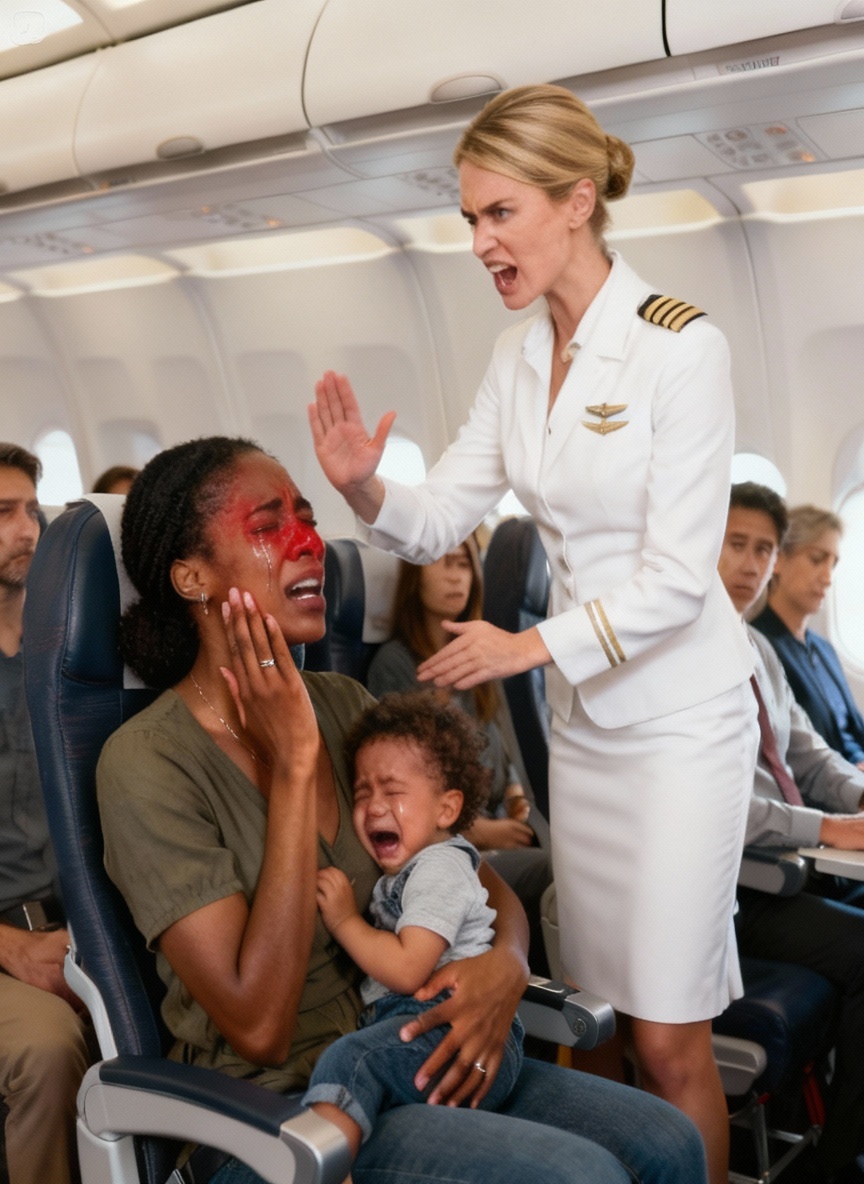 Policzek padł tak nagle, że cały rząd pasażerów wstrzymał oddech, ale nikt się nie ruszył. Młoda czarnoskóra matka, tuląca płaczące dziecko do piersi, została właśnie uderzona w policzek przez stewardesę. Dźwięk odbił się echem w kabinie, a zaraz potem rozległ się przerażony płacz dziecka. Na chwilę w samolocie zapadła cisza. Ludzie wpatrywali się, szeptali, udając, że nie widzą, co się właśnie stało. Niektórzy spuszczali głowy, inni wyciągali telefony, jakby nic się nie stało.