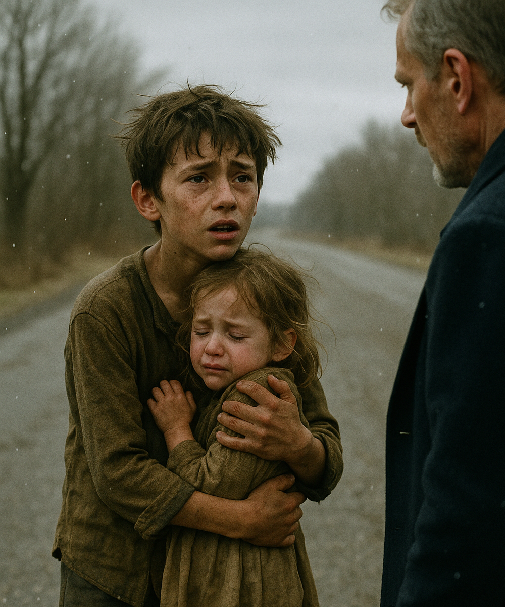 Odwrócił się. Kilka kroków dalej stał bosy chłopiec, nie starszy niż sześć lat, trzymając w ramionach malucha owiniętego w za dużą bluzę z kapturem. Twarz miała bladą, usta drżały. Oczy chłopca były szeroko otwarte ze strachu, ale jego ramiona obejmowały ją opiekuńczo.