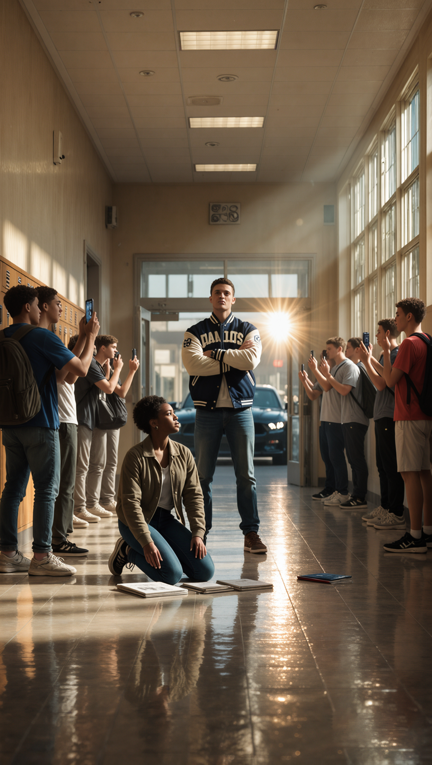Właśnie wtedy zobaczyła Liama Rhodesa – wysokiego, barczystego, o takiej pewności siebie, która sprawiała, że wszyscy albo za nim podążali, albo go unikali. Opierał się o rząd szafek, otoczony kolegami z drużyny w mundurach, a ich śmiech był zbyt głośny, zbyt ochoczy.