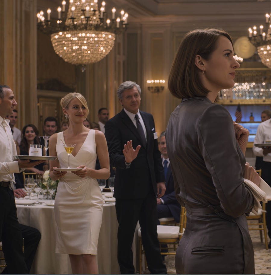 Usiadłam w pokoju Grand Ocean, ubrana w regulaminowy czarny strój hotelowy: koszula zapinana na guziki, spodnie, wygodne buty, z plakietką z napisem VALERIE — ZESPÓŁ EVENTOWY . Nie właścicielka. Nie prezes. Tylko trybik w maszynie.