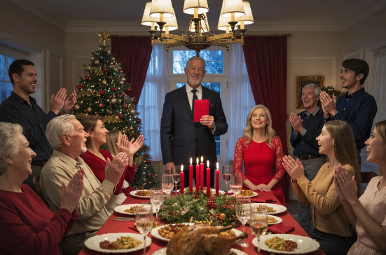 W środku panowała napięta atmosfera. Stół uginał się pod ciężarem pieczonego indyka, szynki w miodzie, puree ziemniaczanego i ciast czekających na pokrojenie. W kącie lśniła choinka, a jej ozdoby błyszczały niczym maleńkie oczy obserwujące rozgrywający się dramat.